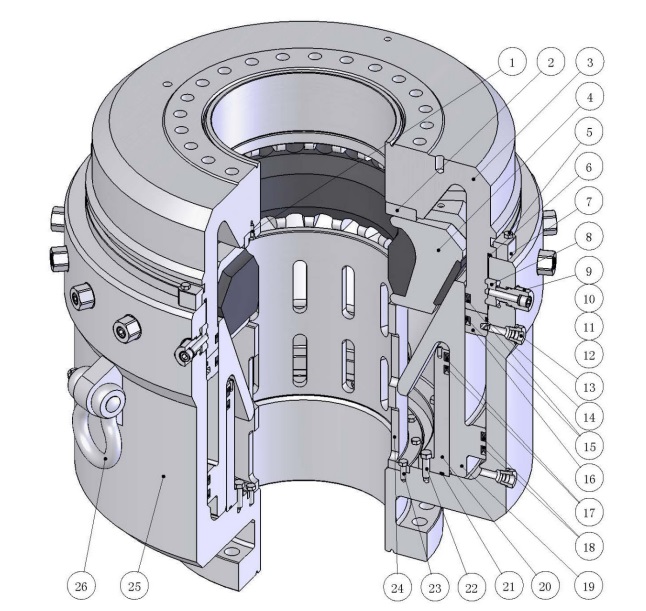 21 1/4”-2000psi annular BOP is constituted by 6 main parts of body, head, piston, outer sleeve, jaw and packing unit. The number of parts is small to enable the BOP to be more reliable and easy for service, and the cover and the shell are jointed by claw chuck, so it is convenient to be dismantled on site. (Refer to Figure 3)