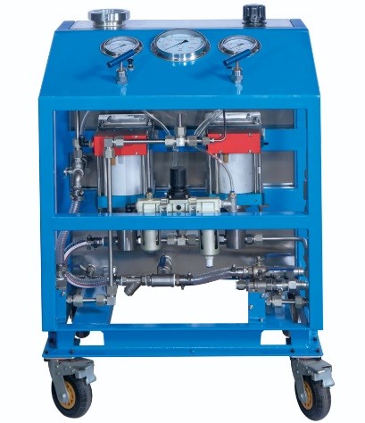 (2) One (1) liquid/air 60:1 pneumatic pump, 1” inlet and 1/2” outlet, working pressure 40MPa, pump flow rate 90mL/stoke.